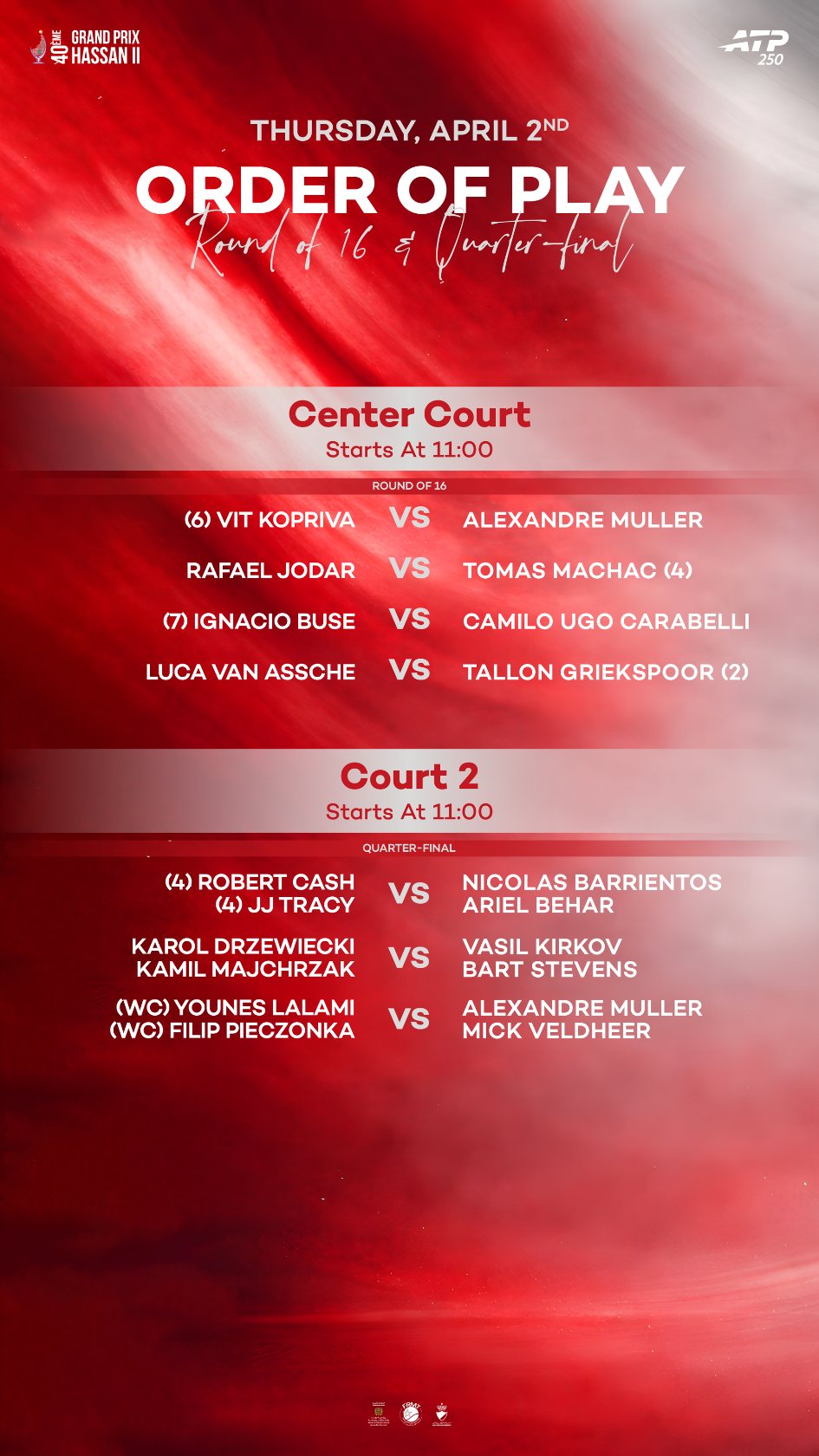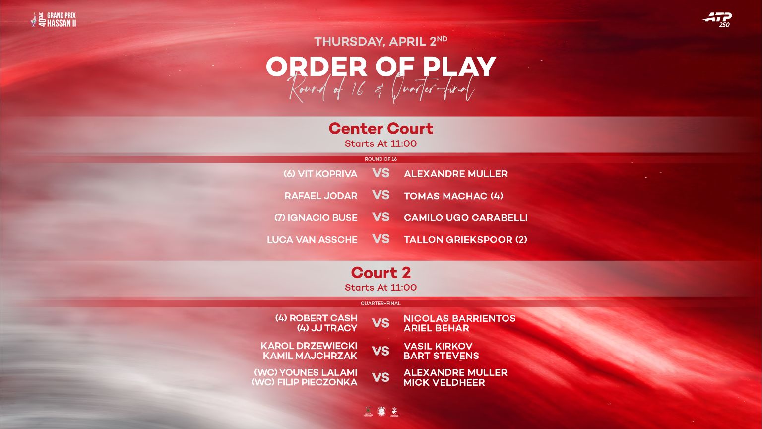 Consultez l’Order of Play du Grand Prix Hassan II pour découvrir le programme détaillé des matchs jour par jour. Retrouvez les horaires officiels, les courts attribués et les rencontres à ne pas manquer afin de suivre toute l’intensité du tournoi ATP 250 de Marrakech.